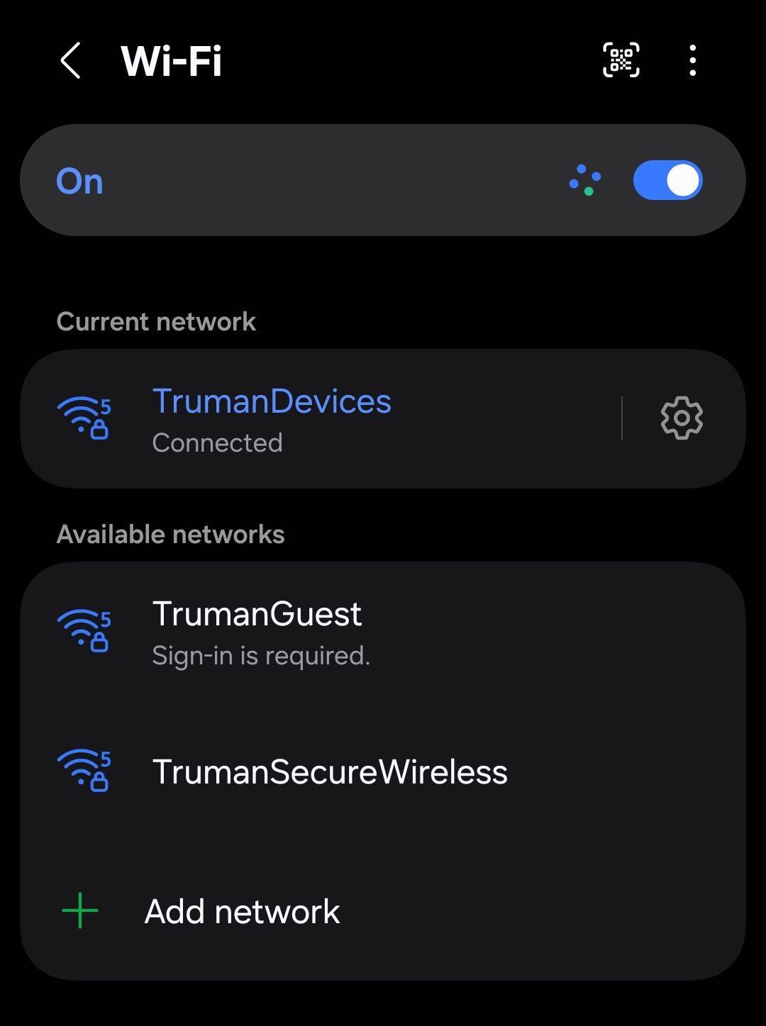 First, go to your Wifi Settings. The steps may vary depending on your device. You can access them by going to Settings > Connections > Wi-Fi. Alternatively, open the Quick Settings panel from your home screen, press and hold the Wi-Fi icon, and then select More Settings. Once open, select the wireless connection called “TrumanSecureWireless”.